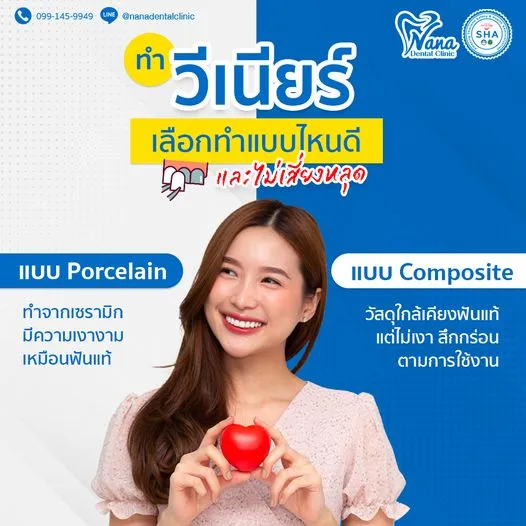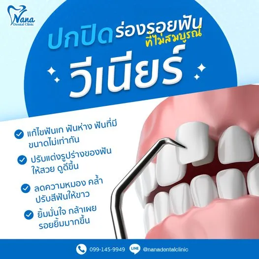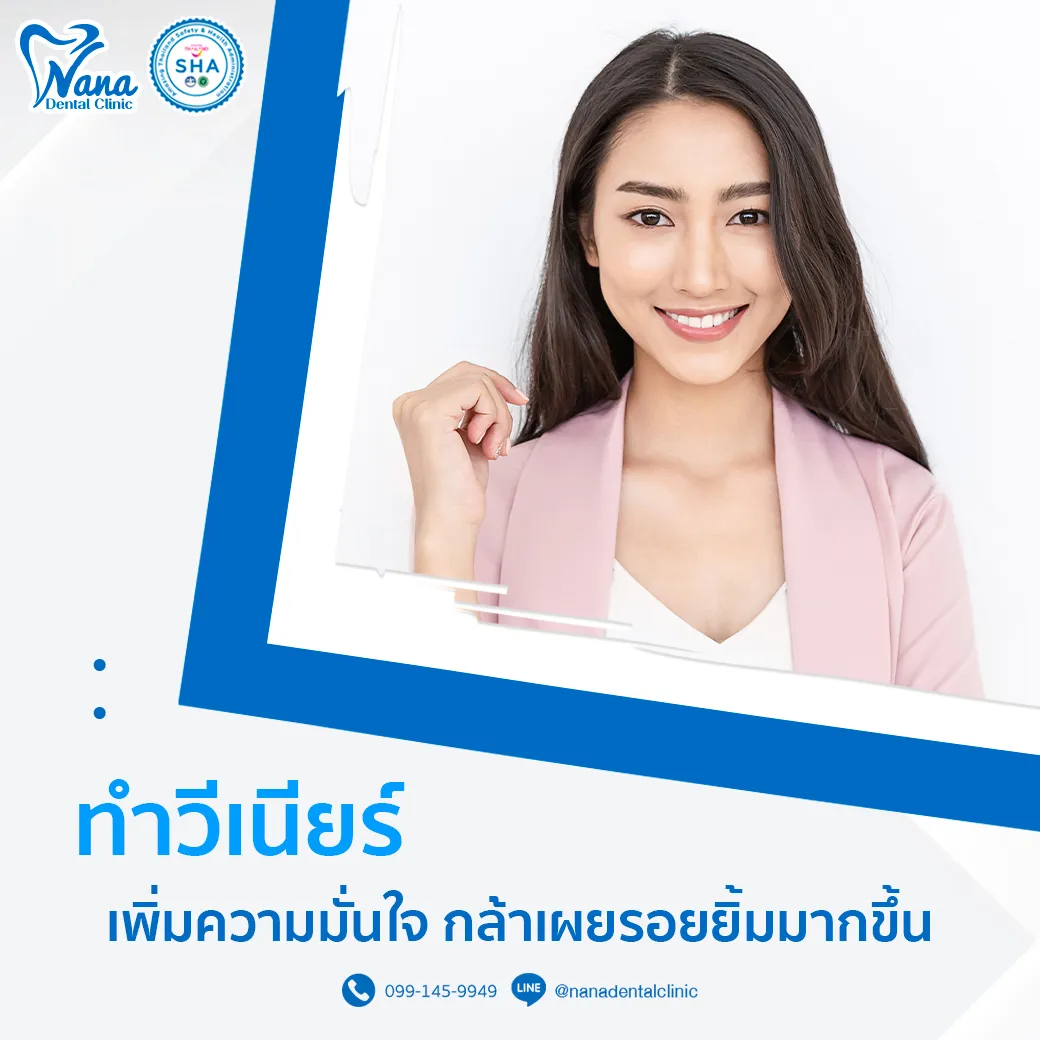วีเนียร์ : ตัวช่วยในการแก้ไขฟันที่มีปัญหาเพียงเล็กน้อย อาจจะเป็นปัญหาสีฟันไม่สม่ำเสมอ ฟันบิ่น ฟันห่าง ฟันแตก หรือฟันเก และเป็นการปกปิดความผิดปกติผิวฟันให้เรียบเนียน🔹 วีเนียร์เป็นการรักษาที่สูญเสียเนื้อฟันเพียงเล็กน้อยและมีการกรอฟันออกเพียงด้านที่มองเห็นเท่านั้น ไม่ต้องกรอฟันออกทั้งซี่🔹 การทำวีเนียร์เหมาะกับผู้ที่ต้องการปรับสี แก้ไขรูปร่างฟัน สำหรับผู้ที่ทำวีเนียร์ควรเลี่ยงการกัด หรือแทะของแข็ง เพราะเสี่ยงแตกหักได้ง่าย
