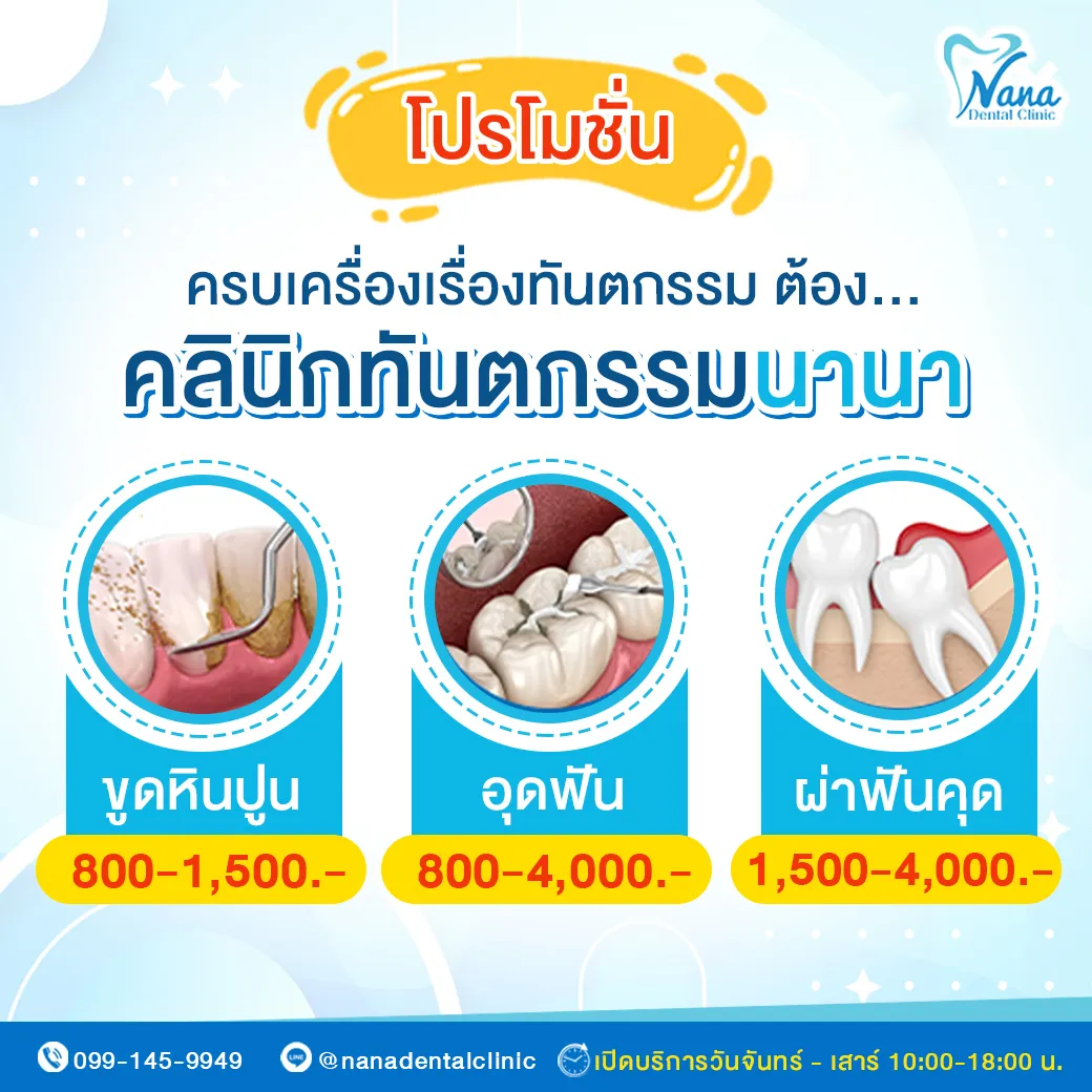 เรื่องดูแลฟันให้เราช่วยดูแล ฟันสวย ฟันดี ดูแลช่องปากให้กลับมาดูดีต้องดูแลที่ "คลินิกทันตกรรมนานา" ขูดหินปูน : 800 - 1,500.- อุดฟัน : 800 - 4,000.- ผ่าฟันคุด : 1,500 - 4,000.-