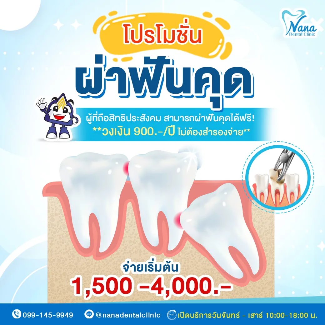 เริ่มต้น 1,500 - 4,000 บาท **ผู้ที่ถือสิทธิประสังคม สามารถผ่าฟันคุดได้ฟรี! วงเงิน 900 บาทต่อปี ไม่ต้องสำรองจ่าย**