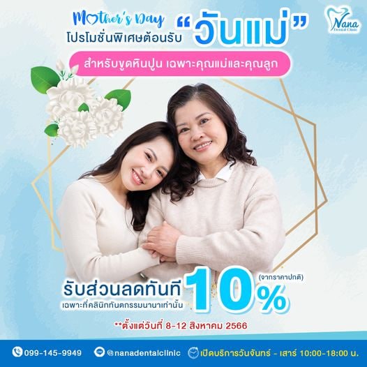 โปรโมชั่นพิเศษต้อนรับวันแม่ เพียงพาคุณแม่มาขูดหินปูน 🦷 🔖 รับส่วนลดทันที 10% (จากราคาปกติ) 📍 เฉพาะที่คลินิกทันตกรรมนานาเท่านั้น ℹ️ ตั้งแต่วันที่ 8-12 สิงหาคม 2566
